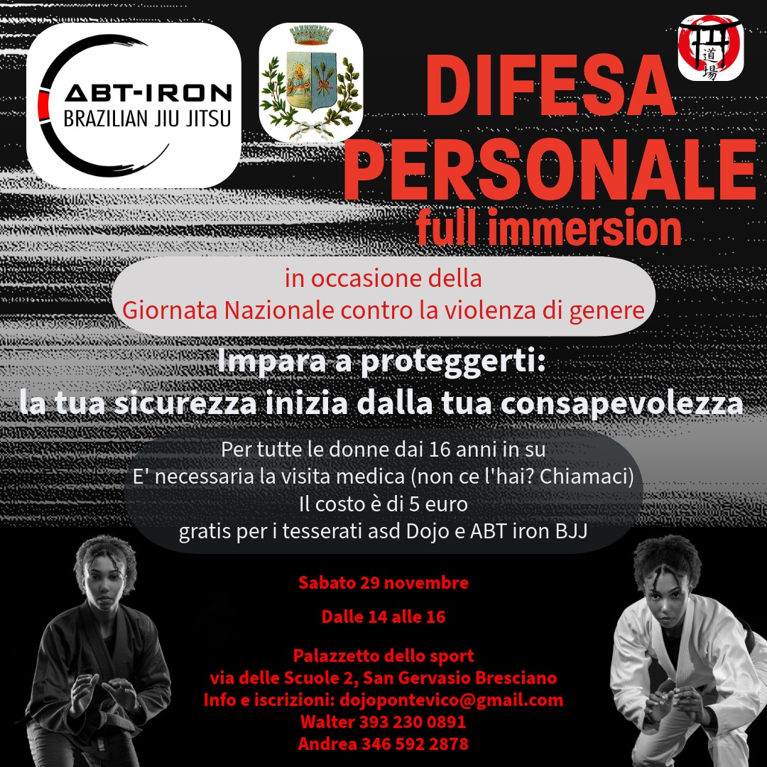In occasione della Giornata Internazionale contro la violenza di genere, l'ASD il Dojo organizza, in collaborazione del Comune, un corso Full Immersion di difesa personale, per tutte le donne dai 16 anni in su.
