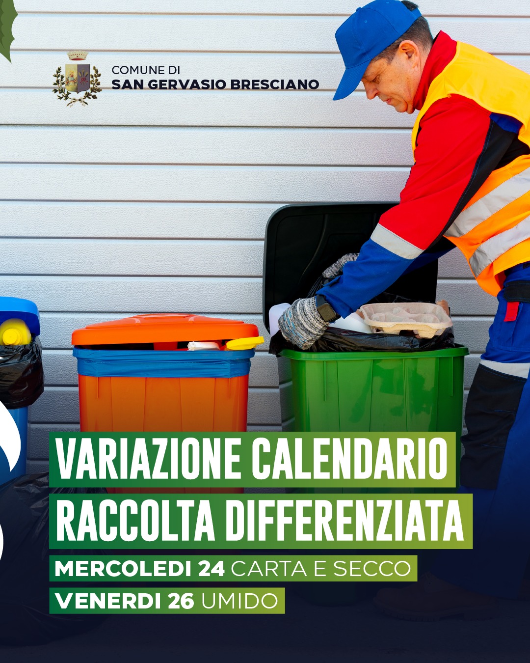 Variazione al calendario della raccolta differenziata per mercoledì 24 e il venerdì 26 dicembre 2025
